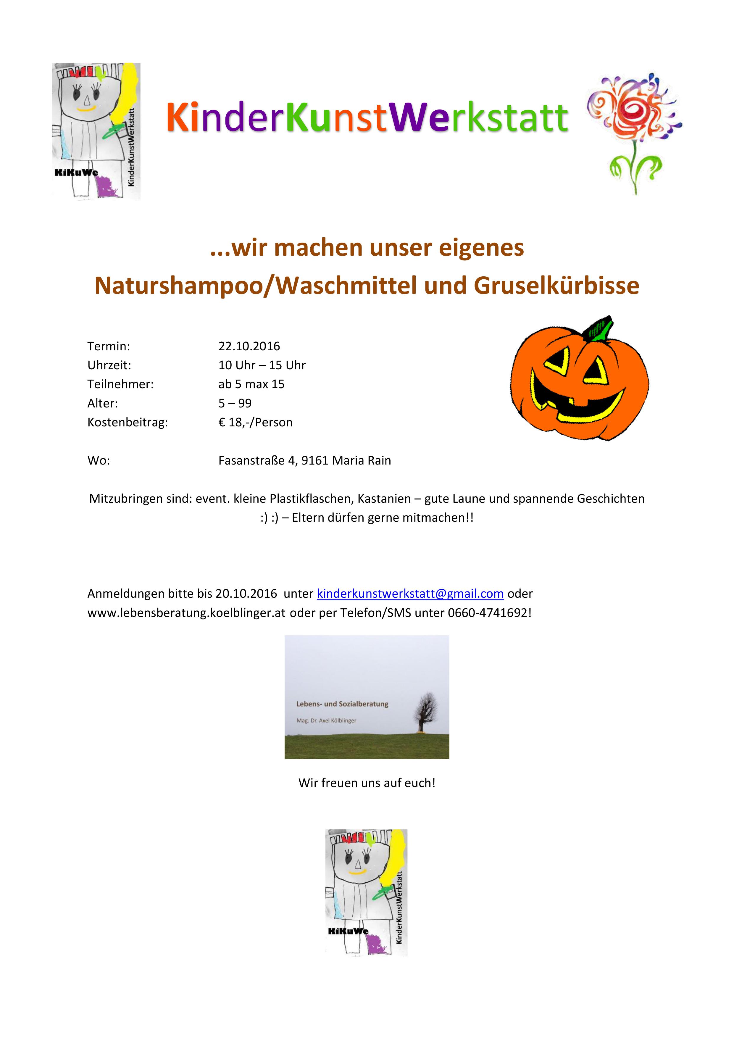 Anmeldungen bitte bis 20.10.2016 unter kinderkunstwerkstatt@gmail.com oder www.lebensberatung.koelblinger.at oder per Telefon/SMS unter 0660-4741692!